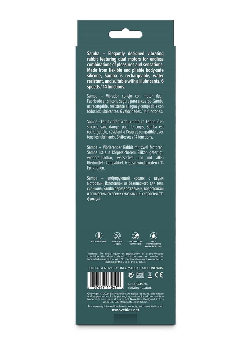 Samba b Elegantly designed vibrating rabbit featuring dual motors for endless combinations of pleasures and sensations. Made from flexible and pliable body-safe silicone, Samba is rechargeable, water resistant, and is suitable for use with all lubricants including silicone lubricant. 6 speeds / 14 functions IPX5 waterproof rating.